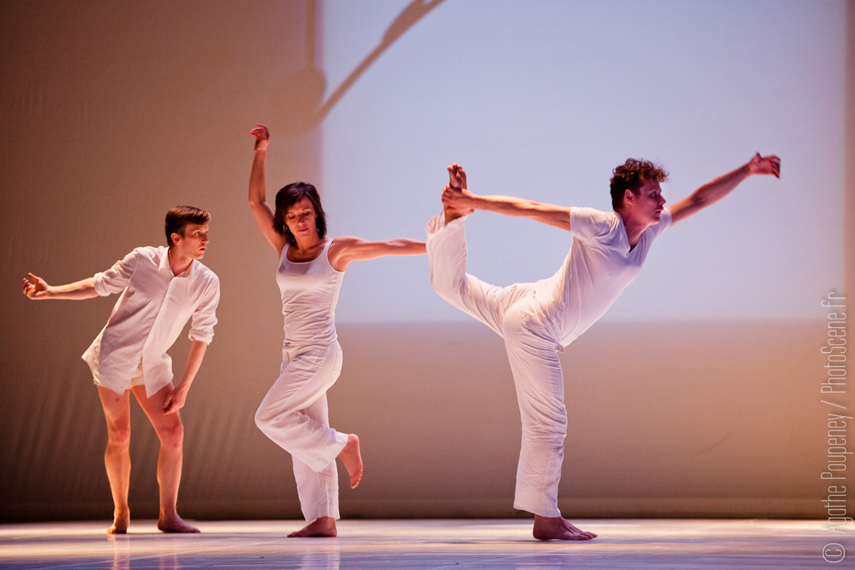 Un espace blanc, nu, avec seulement un mobile, blanc lui aussi, pour mieux capter la lumière. Il tournoie, comme une toupie "caldérienne". Des lignes brisées dans l'espace, des corps qui surgissent. Menus et pâles, en tee-shirt et boxer bleu pâle. Combinaisons subtiles qui composent un langage corporel abstrait, presque savant. Des mouvements fluides et amples, inlassablement répétés comme une psalmodie. Subtile mécanique du corps démantelée. Rondeur du geste qui cherche à caresser l'air, à épouser sa pulsation intime. Comme celle de la musique, un concerto pour clavecins et cordes de J.S. Bach. La danse est légère, volubile, et parfois lascive. Complexe, aussi, évidemment. Audacieuse, même, parfois. Elle s'affranchit systématiquement de la partition tout en s'y rattachant par de minuscules détails. Etablissant de subtiles correspondances entre les deux arts.